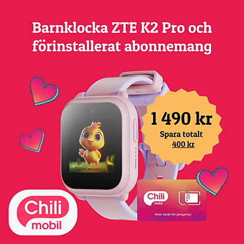Vårt populära paket med barnklocka och abonnemang förinstallerat som gör att du enkelt kommer igång! ZTE Barnklocka K2 Pro med Chilimobil abonnemang! Abonnemanget kostar 99 kr i månaden och faktureras separat måndadsvis. Läs mer här om abonnemanget: https://chilimobil.se/barnklocka/
