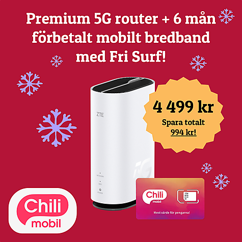 Spara totalt 994 kr vid köp av premium 5G router med 6 månaders förbetalt bredbandsabonnemang i ett paket. Fri Surf och Full fart ingår!